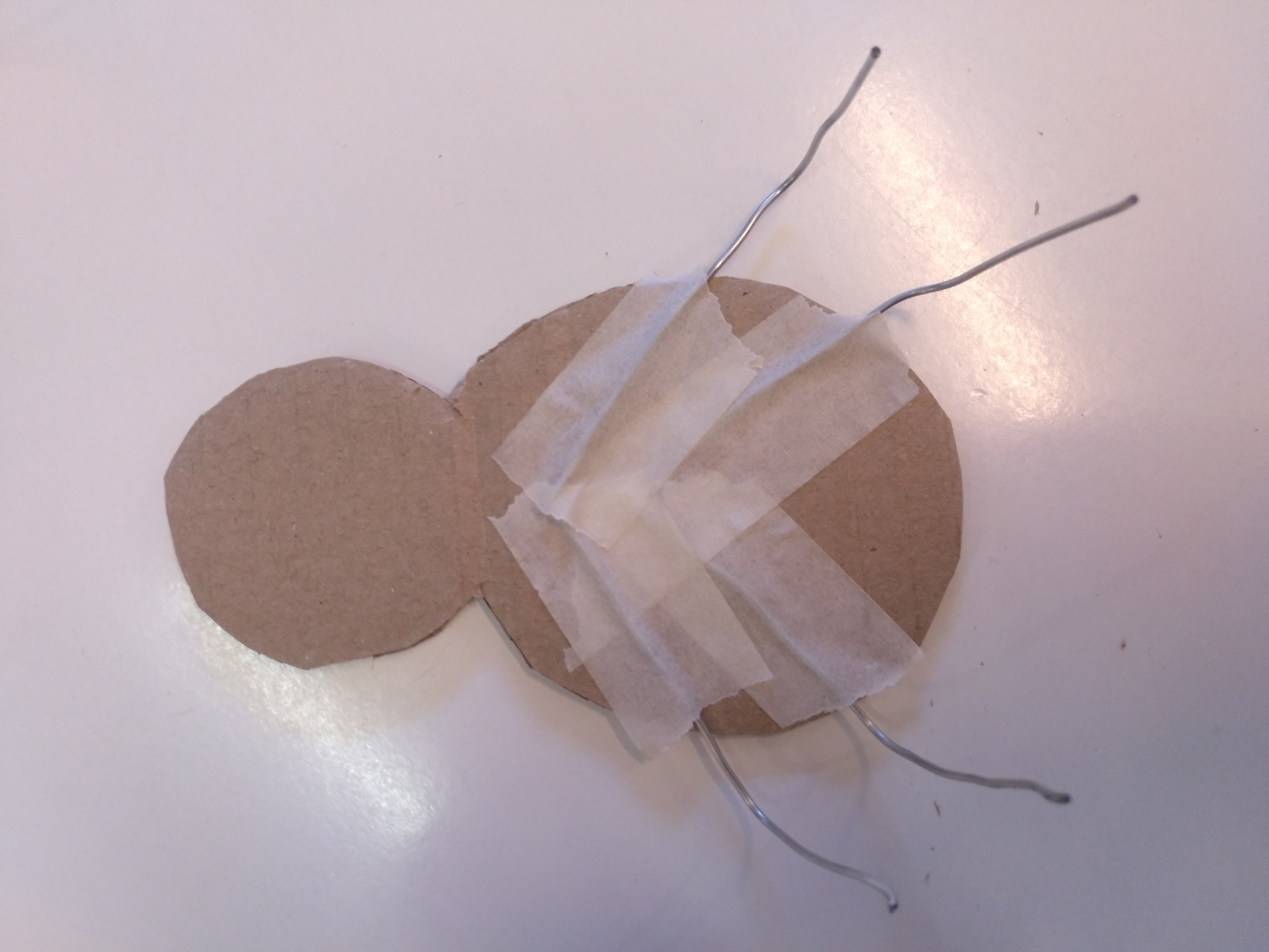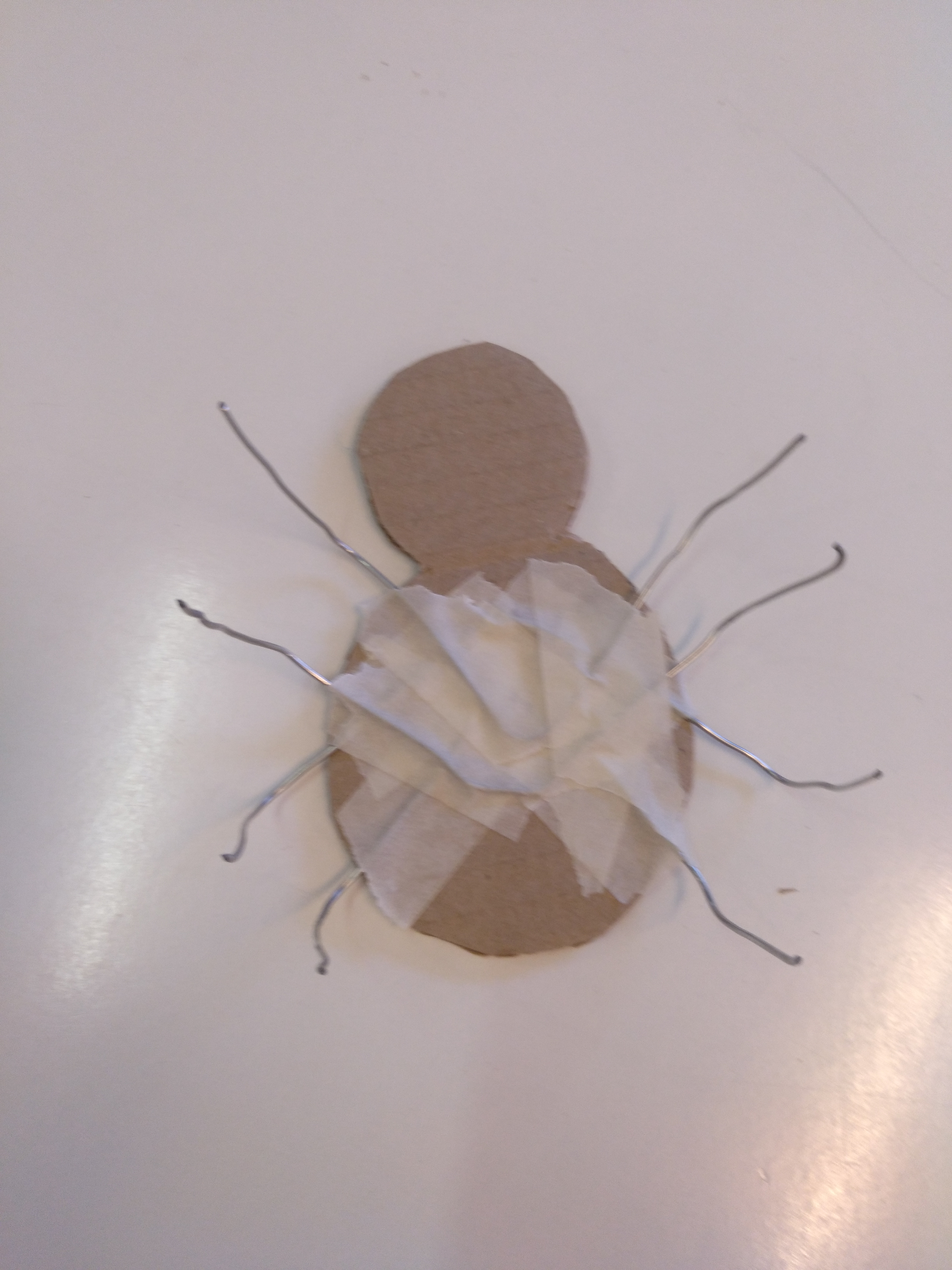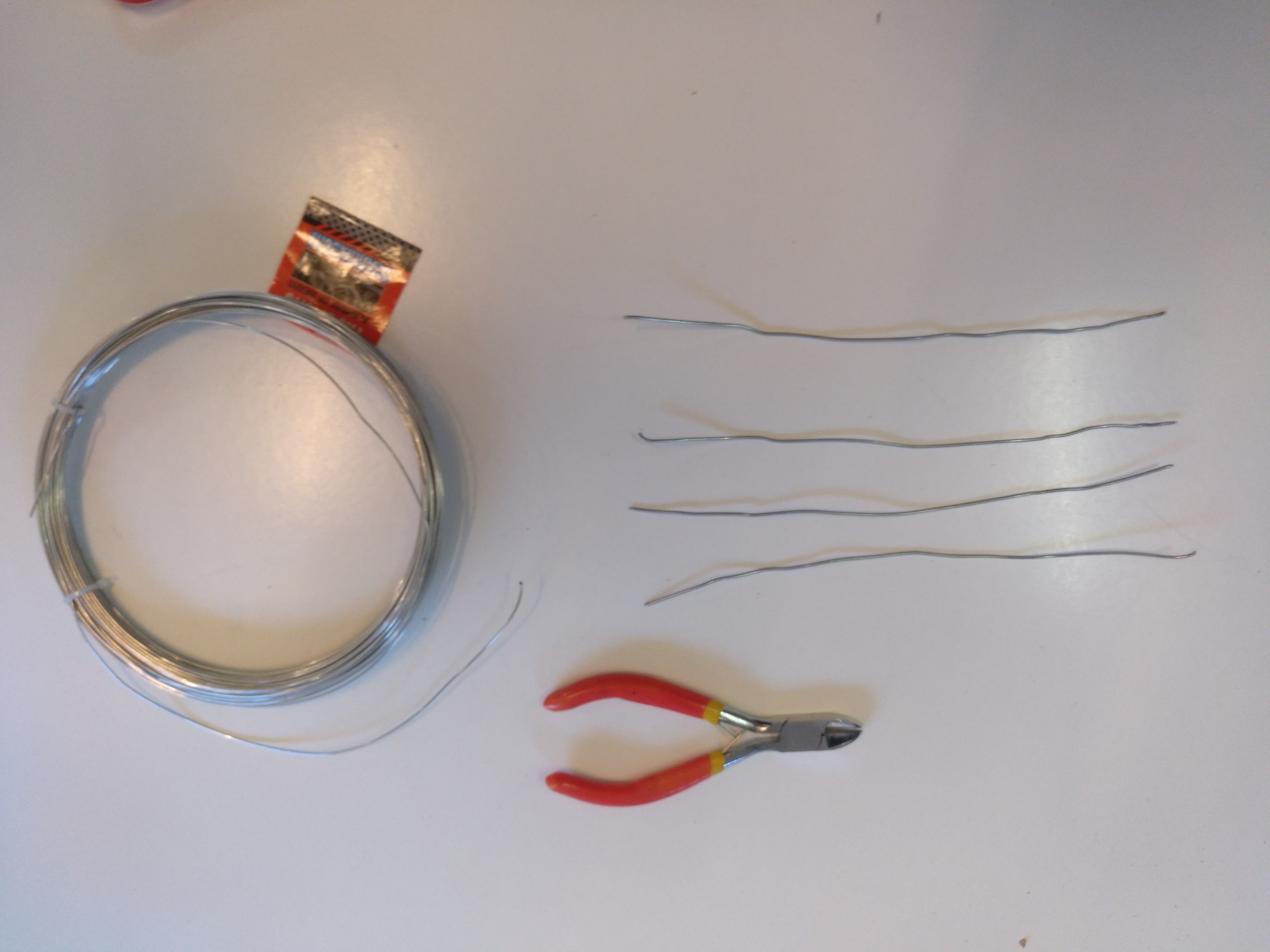 Tallem 4 filferros d'un pam i els dobleguem com a la imatge, fent les potes i torçant l'eix perquè no es desmonti: