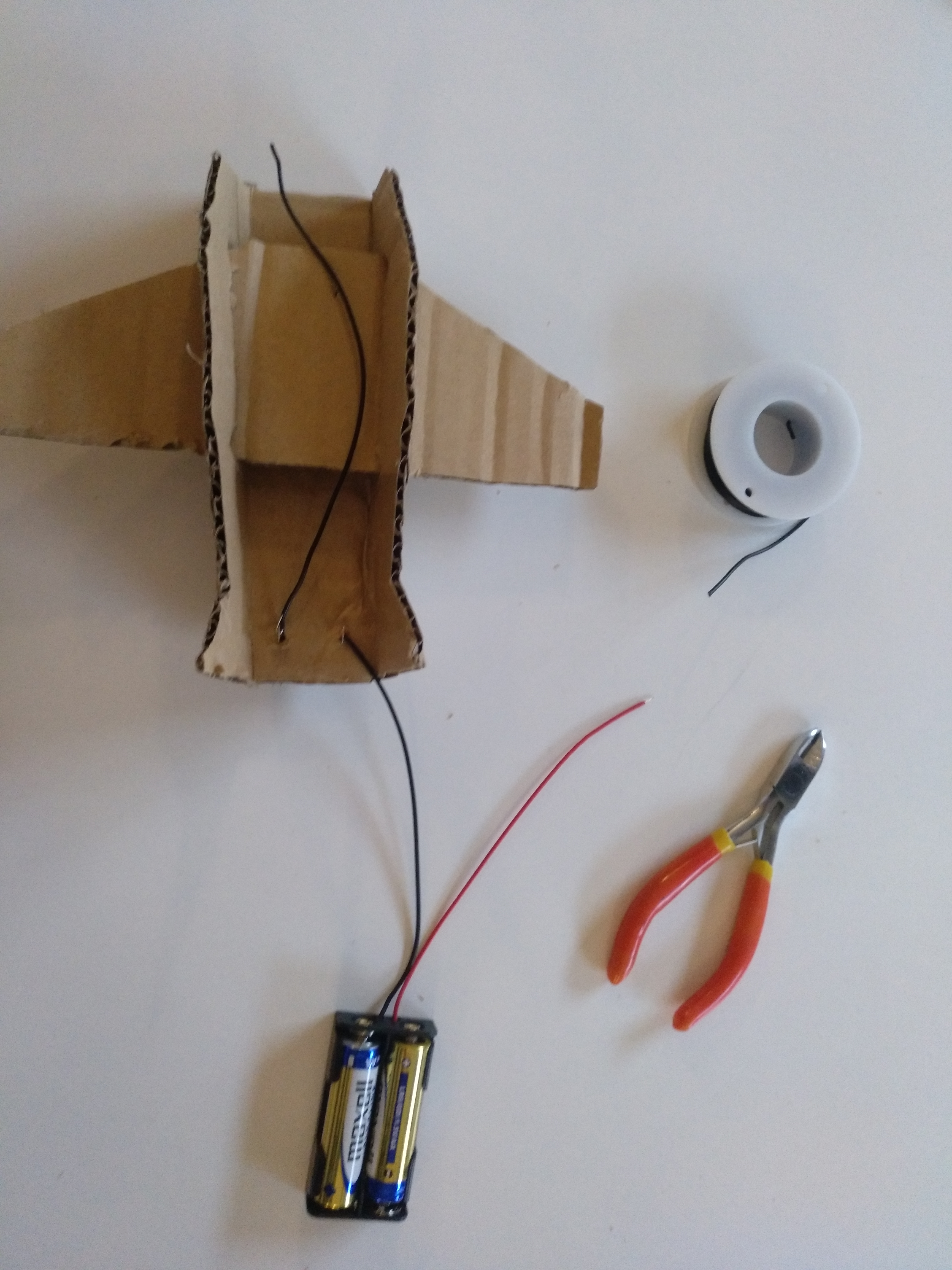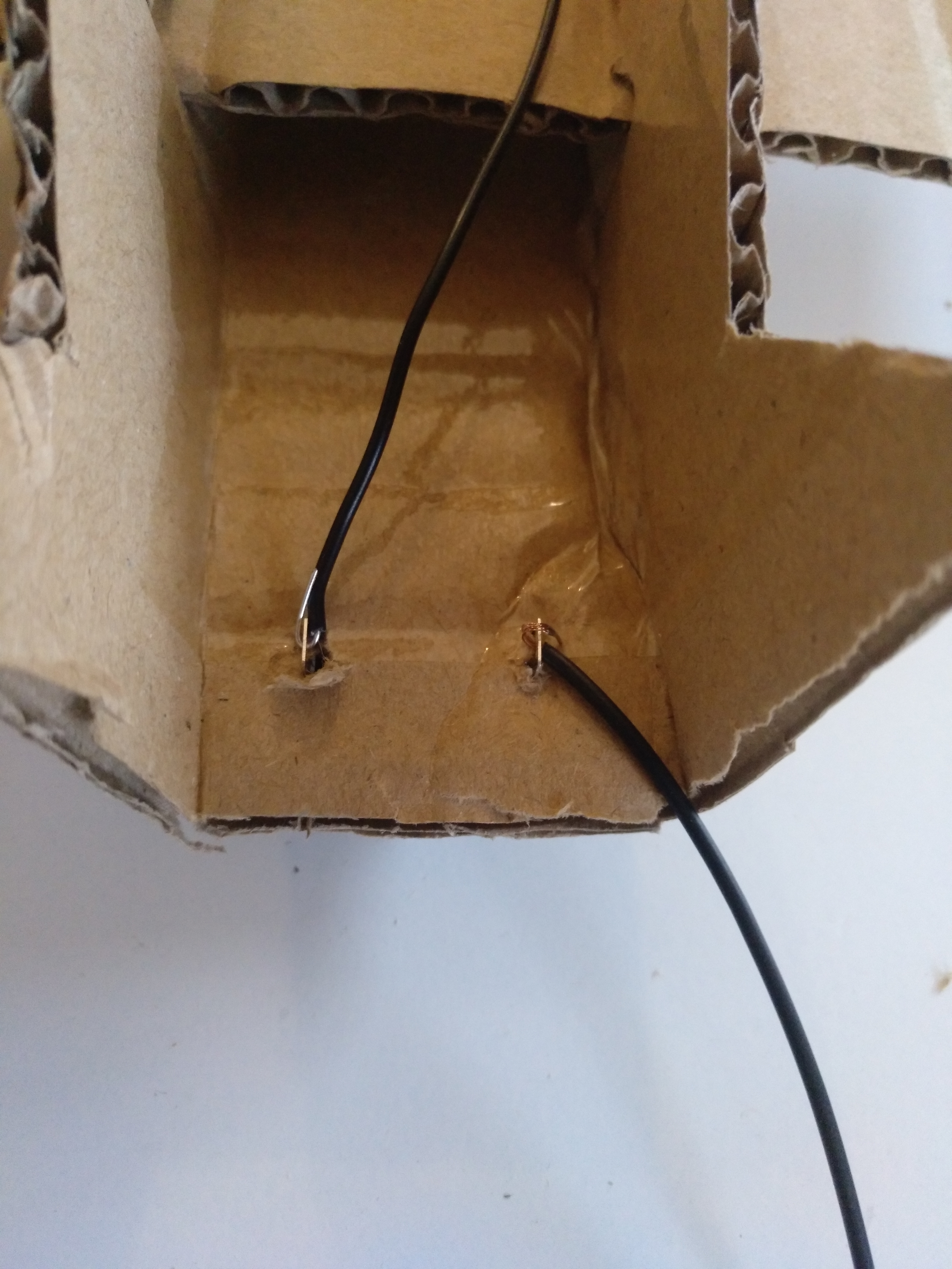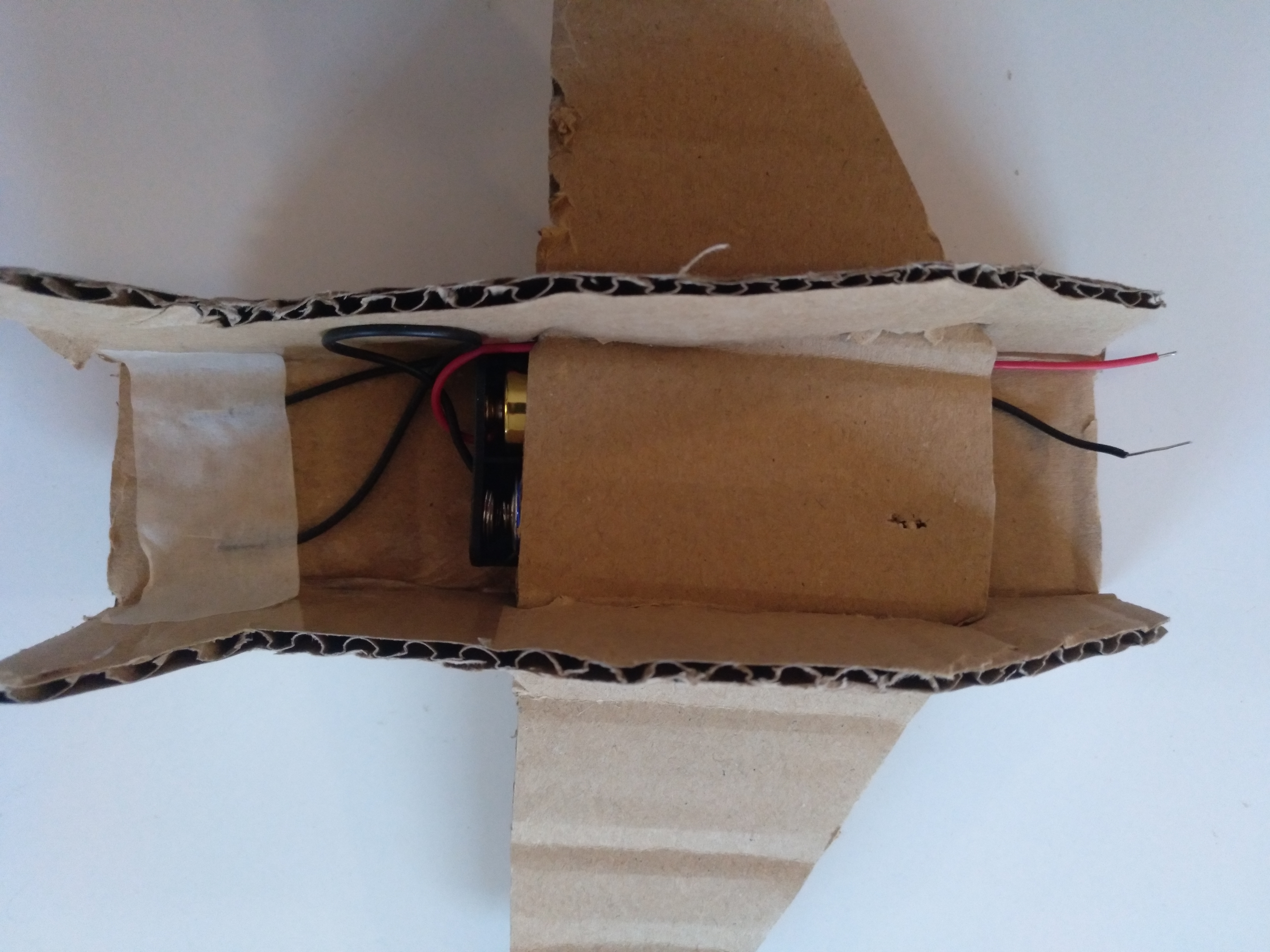 Amb l'ajuda d'una xinxeta o punxó fem forats pel polsador, fem les connexions, col·loquem el porta piles sota les ales i protegim les connexions amb cinta adhesiva