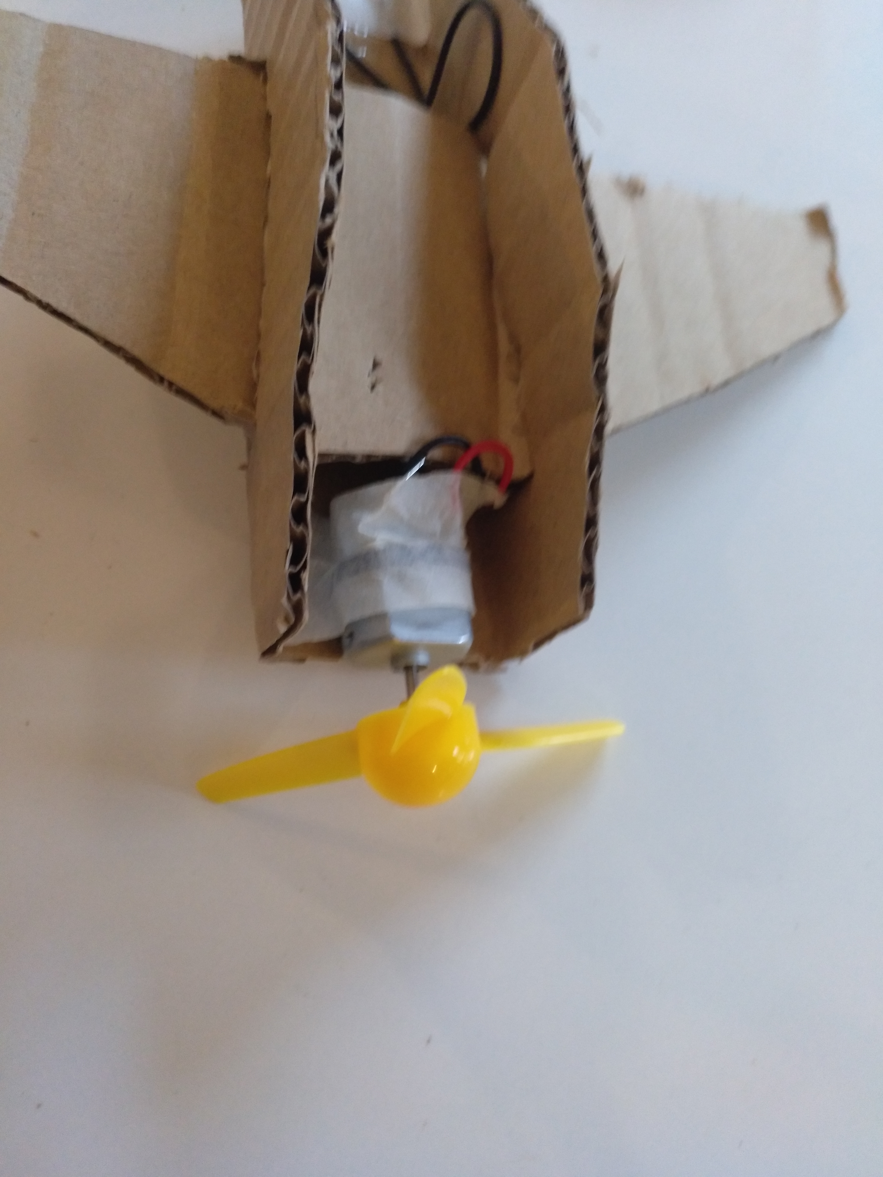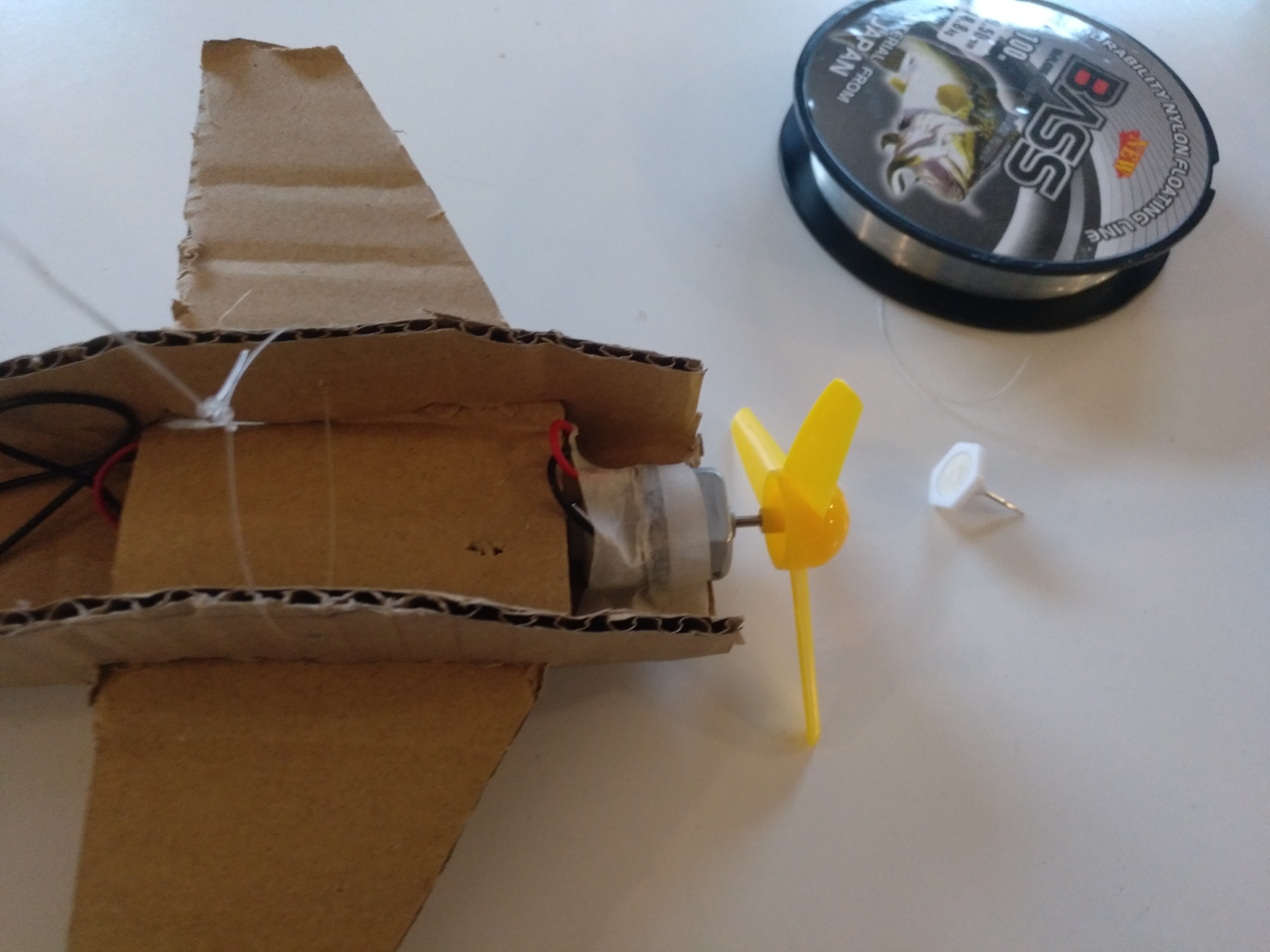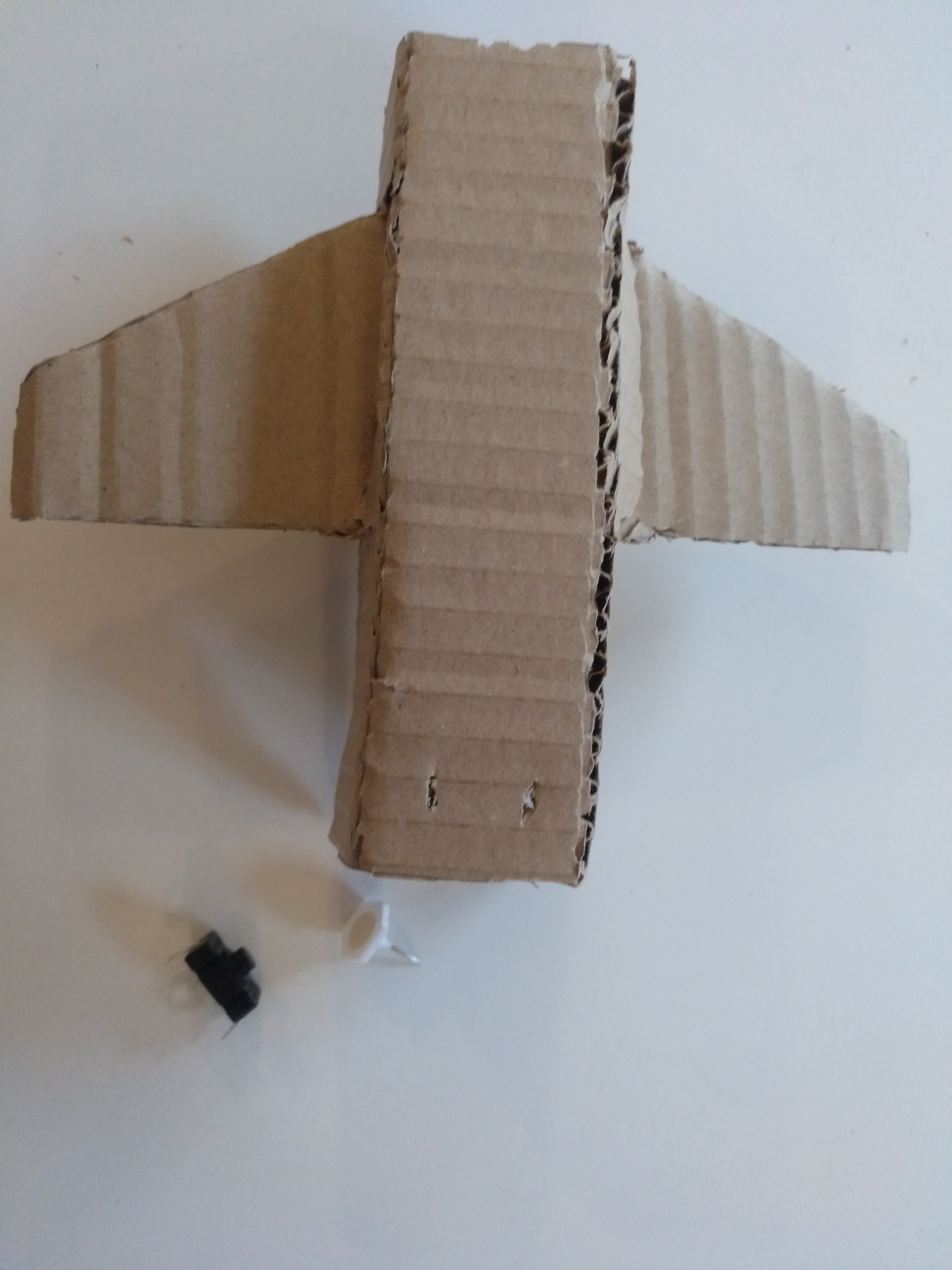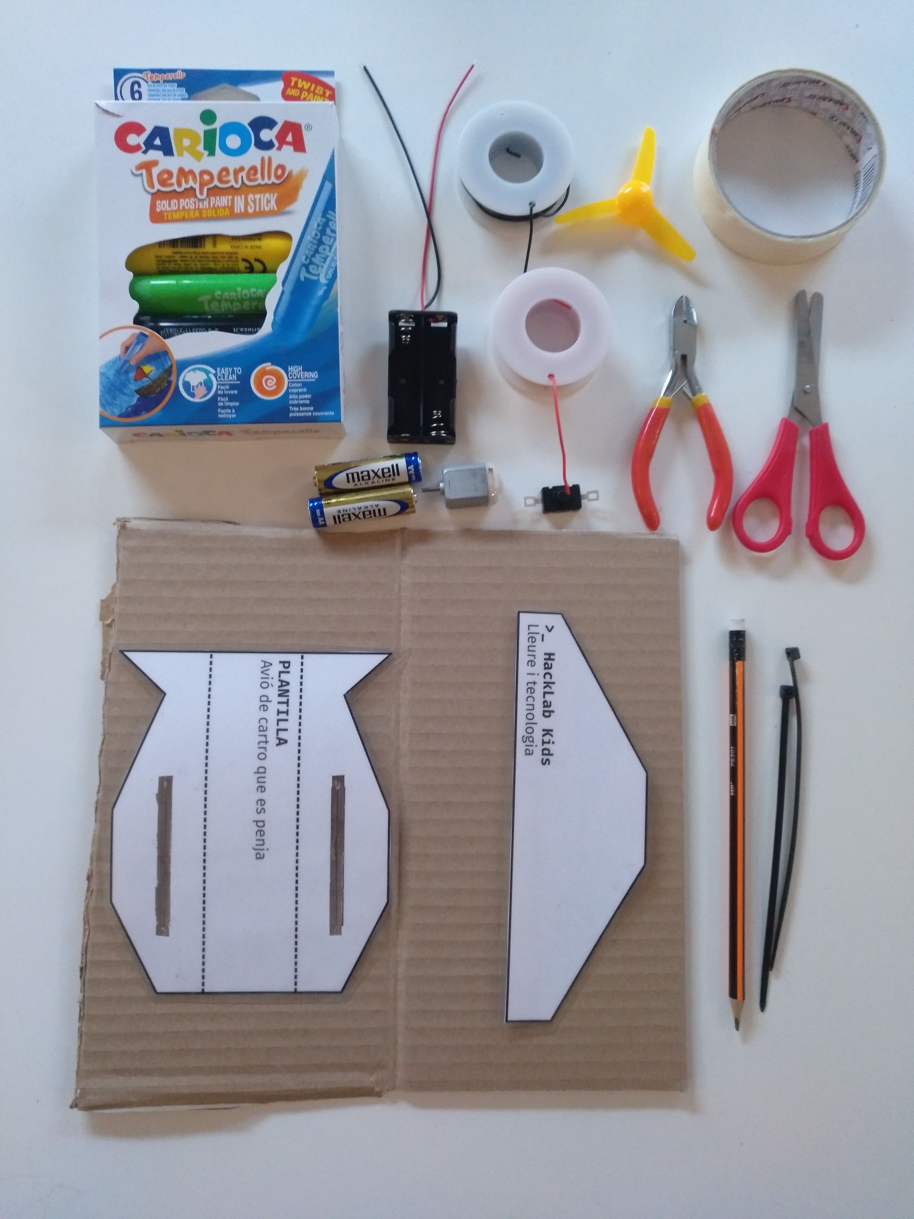Amb l'ajuda d'una xinxeta o punxó fem forats pel polsador, fem les connexions, col·loquem el porta piles sota les ales i protegim les connexions amb cinta adhesiva