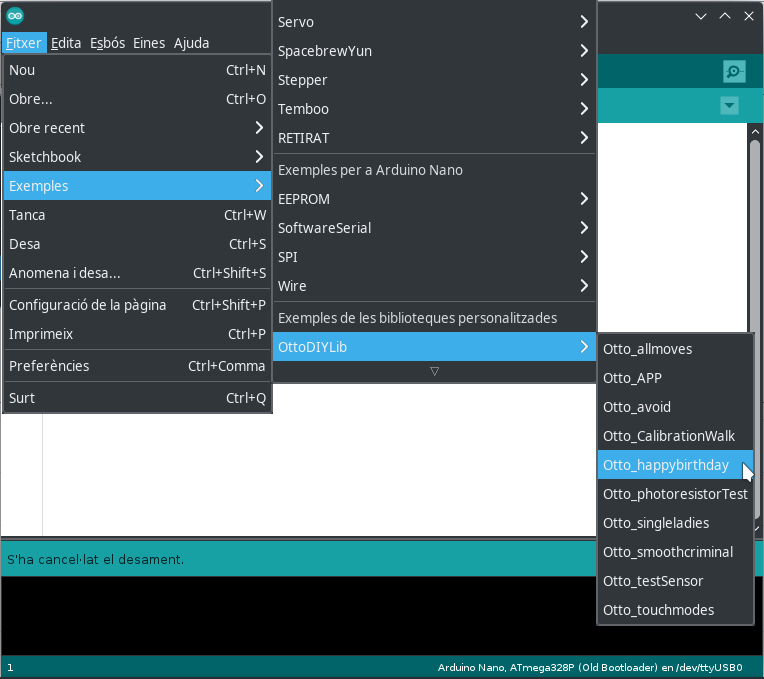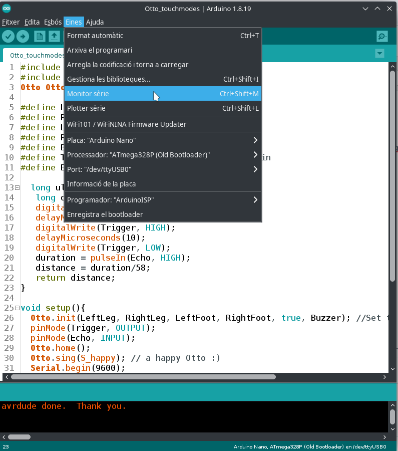 - El port correcte: /dev/ttyUSB0 o similar (cal que l'Otto estigui connectat al ordinador per USB)