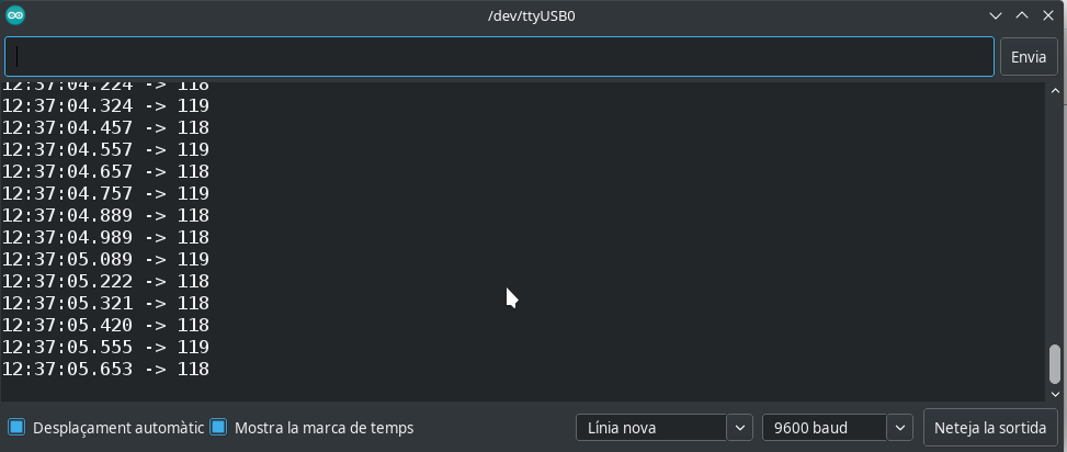 Anar a Eines > Monitor de sèrie i configurar-lo a 9600 baud. Hauríem de veure la distància que llegeixen els ultrasons.