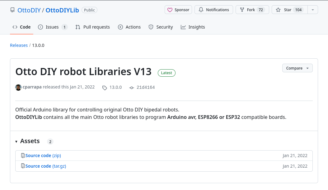 Primer de tot em de preparar la IDE Arduino amb la llibreria https://github.com/OttoDIY/OttoDIYLib . Per fer ho anirem a la pàgina del projecte de GitHub, a l'apartat de "Releases" i descarregarem la llibreria en format zip https://github.com/OttoDIY/OttoDIYLib/archive/refs/tags/13.0.0.zip