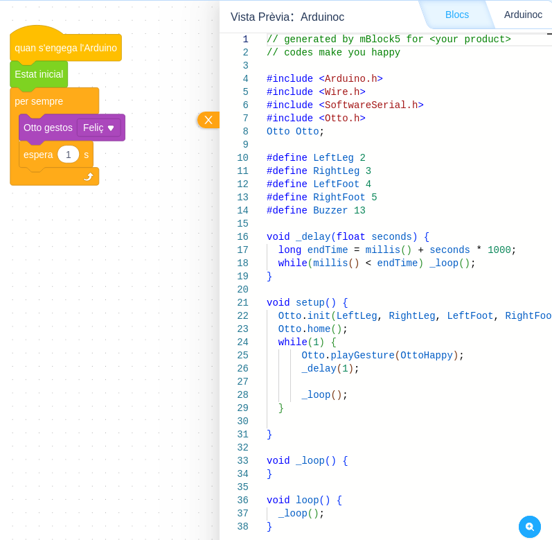 // generated by mBlock5 for <your product>// codes make you happy#include <Arduino.h>#include <Wire.h>#include <SoftwareSerial.h>#include <Otto.h>Otto Otto;#define LeftLeg 2#define RightLeg 3#define LeftFoot 4#define RightFoot 5#define Buzzer 13void _delay(float seconds) {long endTime = millis() + seconds * 1000;while(millis() < endTime) _loop();}void setup() {Otto.init(LeftLeg, RightLeg, LeftFoot, RightFoot, true, Buzzer); //Set the servo pins and Buzzer pinOtto.home();while(1) {Otto.playGesture(OttoHappy);_delay(1);_loop();}}void _loop() {}void loop() {_loop();}